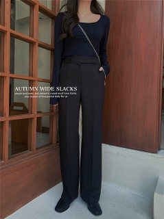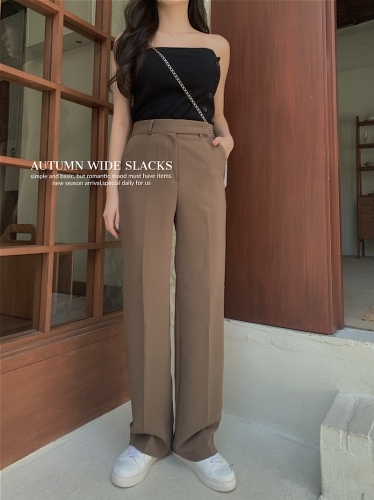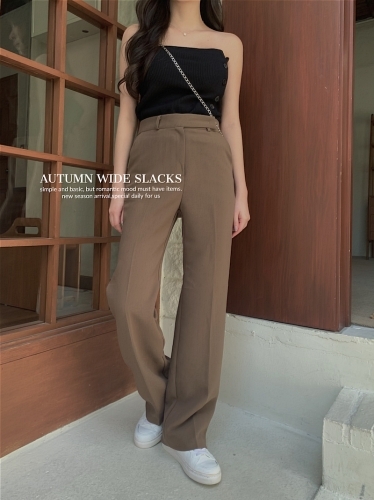 看得出有腿縫的斜釦微寬栗子西裝褲