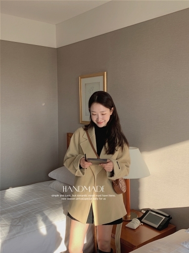 因為它不是駝色,它就是偏淺的奶油黃的感覺,是手工大衣比較少見的色
